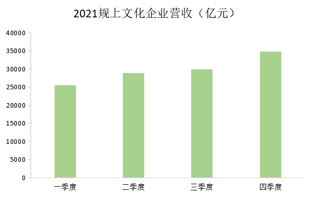 从收入数据看,2021年,根据国家统计局对全国6.5万家规模以上文化及相关产业企业调查,上述企业实现营业收入119064亿元,比上年增长16.0%;两年平均增长8.9%,比2019年同比增速加快1.9个百分点;分季度看,一季度、上半年及前三季度上述企业两年平均分别增长10.0%、10.6%和10.0%,均高于2019年同期同比增速。2021年以来,我国文化企业发展虽然受到局部地区疫情汛情叠加等因素影响,但助企纾困政策措施落实有力,我国文化产业保持较快增长,恢复基础得到巩固。