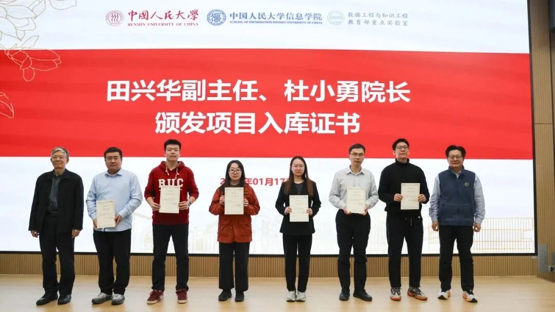 在聘任仪式环节,中国人民大学杜小勇教授为平台专家颁发聘书。随后,北京市大兴区科委副主任田兴华与杜小勇院长共同为首批入库项目团队颁发证书。