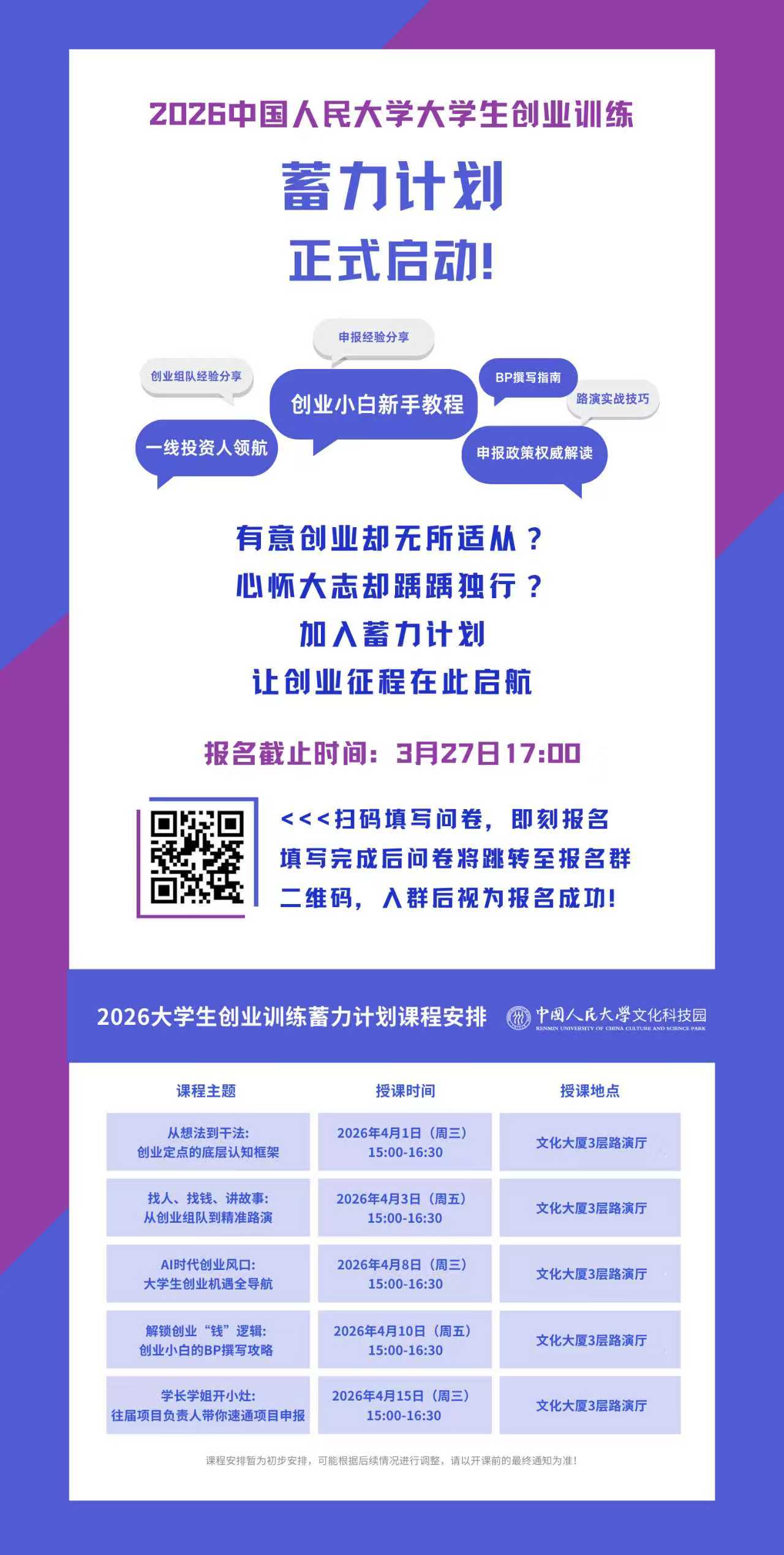 课程简介:作为中国人民大学“大学生创业训练计划”的前置培养项目,大学生创业训练“蓄力计划”由人大文化科技园于2022年发起。项目通过创业知识传授、创业技能教学、企业交流参访等方式,引导学生建立起对创新创业的正确认知,打造有影响力的创新创业实践品牌,为学生深入了解“大学生创业训练计划”并切实开展创业实践训练提供了窗口和机遇。