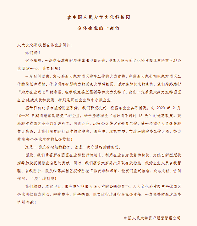 2月3日,园区发布《致人大文化科技园全体企业的一封信》,率先发布为所有延期复工企业减免15天房租(含物业费)政策政策惠及园区150多家企业,减免金额预计达到300余万元。同时,园区网络中心同步减免网络信息费,尽最大努力支持企业渡过难关。