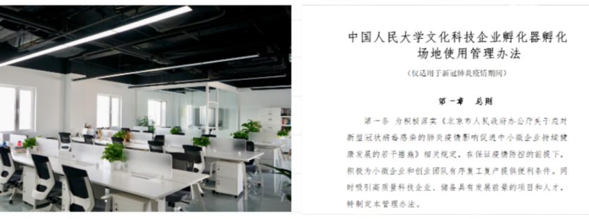 3月24日,人大孵化器在全力做好疫情防控工作的同时,积极响应北京创业孵育协会倡议,与北京地区85家创业孵化机构共同发起“共同防疫帮扶小微企业复工复产”倡议书。孵化器制定新冠肺炎疫情期间《人大文化科技企业孵化器孵化场地使用管理办法》,为优质文化科技小微企业和创业团队提供优惠办公工位和各项孵化基础服务、增值服务,积极为小微企业和创业团队有序复工复产提供便利条件的同时,吸引一批具有发展前景的项目和人才入驻。