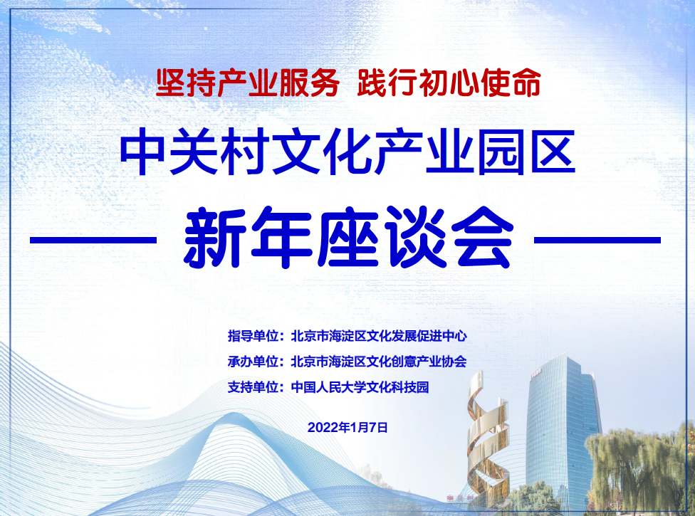 为进一步提升中关村文化园区的创新力、竞争力、辐射力,打造具有国际影响力的新兴产业集群、智慧生态园区,促进文化产业高质量发展,2022年1月7日,由北京市海淀区文化发展促进中心指导、北京市海淀区文化创意产业协会和中国人民大学文化科技园联合承办的“中关村文化产业园区新年座谈会”在中国人民大学文化大厦成功召开。