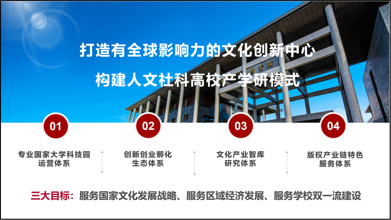 在学校大力支持下,文化科技园从创立起始就把初心和使命定位于“打造有全球影响力的文化科技创新中心”,在主题上独树一帜地确立推动文化科技融合、版权要素流通为主攻方向,持续探索人文社会科学成果转化应用新路。