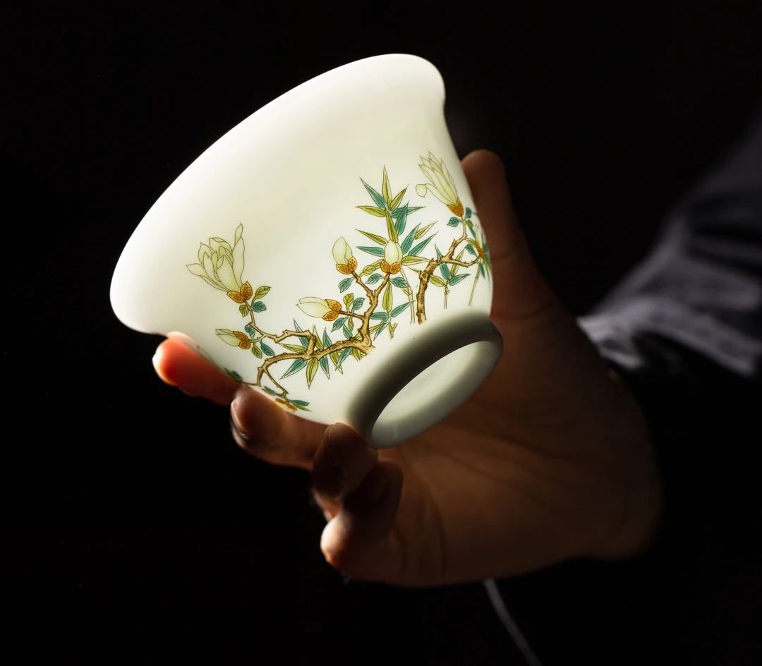 从器物到精神的转译,玉兰花开茶具系列采用“半手工半机械”制作工艺,茶具采用景德镇高温硬质瓷,结合珐琅彩釉料,历经彩绘、制版、贴花、烧制等二十余道工序,最终呈现流光溢彩的质感。