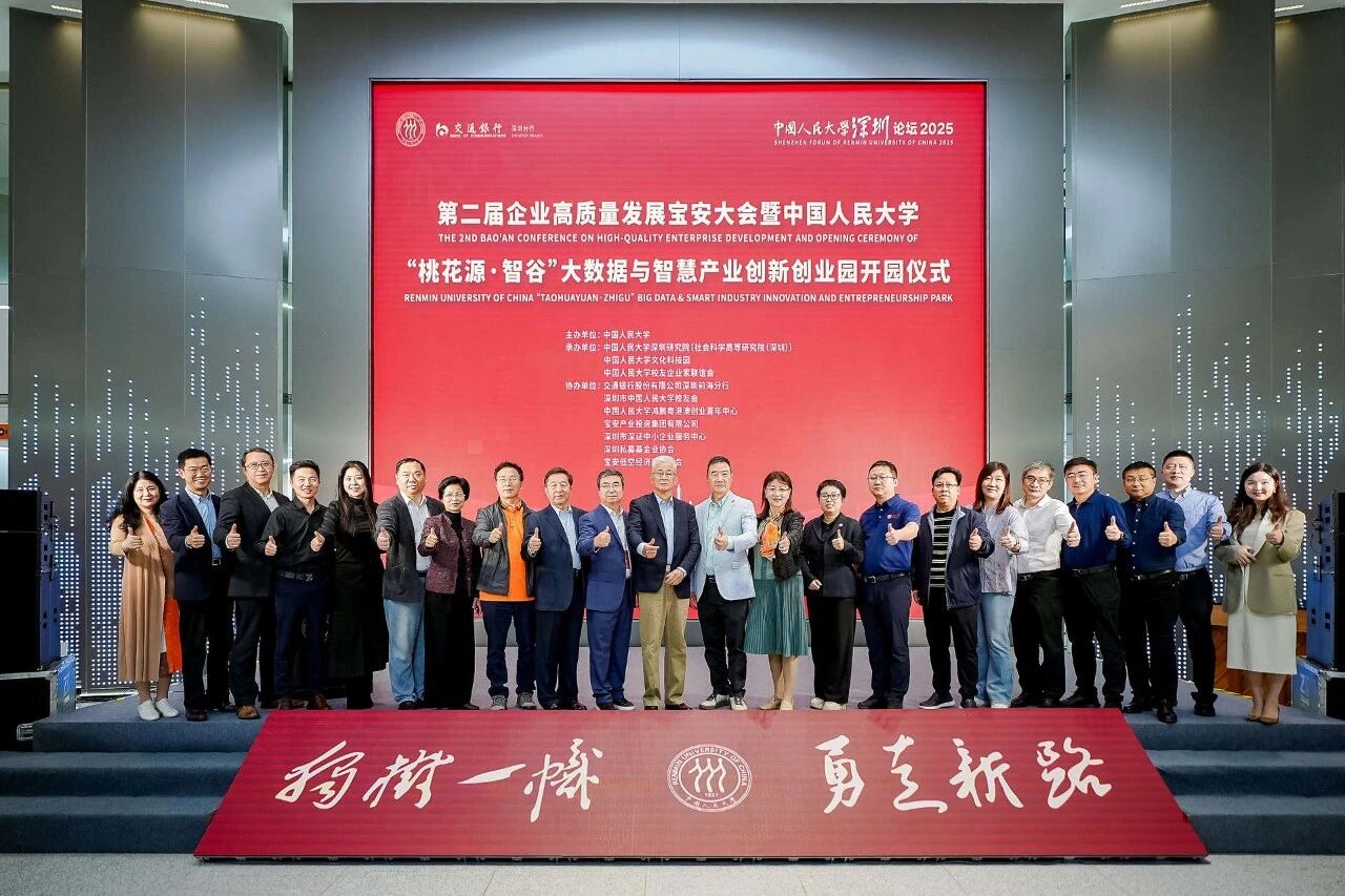 2025年12月21日,由中国人民大学文化科技园、深圳研究院及校友企业家联谊会联合主办的 “第二届企业高质量发展宝安大会暨中国人民大学‘桃花源·智谷’创新创业园开园仪式”在深圳宝安区隆重举行!本次活动作为中国人民大学深圳论坛2025的核心环节,以“智创未来,融通生态——打造新质生产力发展新高地”为主题,聚焦人工智能与产融结合,推动“科技—产业—金融”高效循环,助力粤港澳大湾区加速向“创新策源地”迈进。