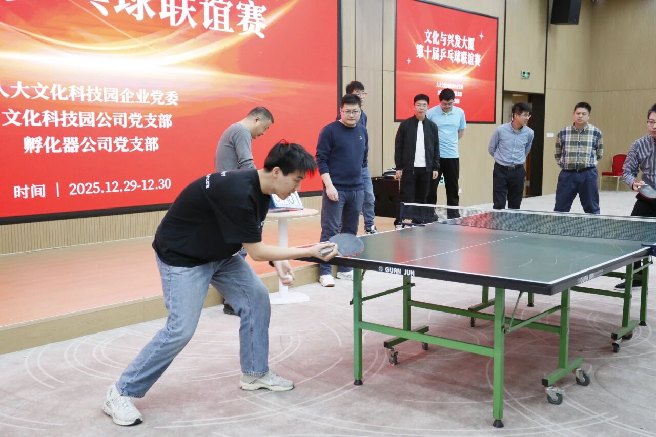 为深入推动“健康中国”战略落地见效,精准对接园区企业党员、职工对高品质健康生活的需求,以奋进姿态迎接2026年到来,2025年12月29日至30日,人大文化科技园企业党委联合文化科技园党支部、孵化器公司党支部成功举办第十届乒乓球联谊赛。来自锐源风能党支部、文化科技园党支部等单位的20余名党员及入党积极分子踊跃参与,在切磋竞技中凝聚奋进力量。